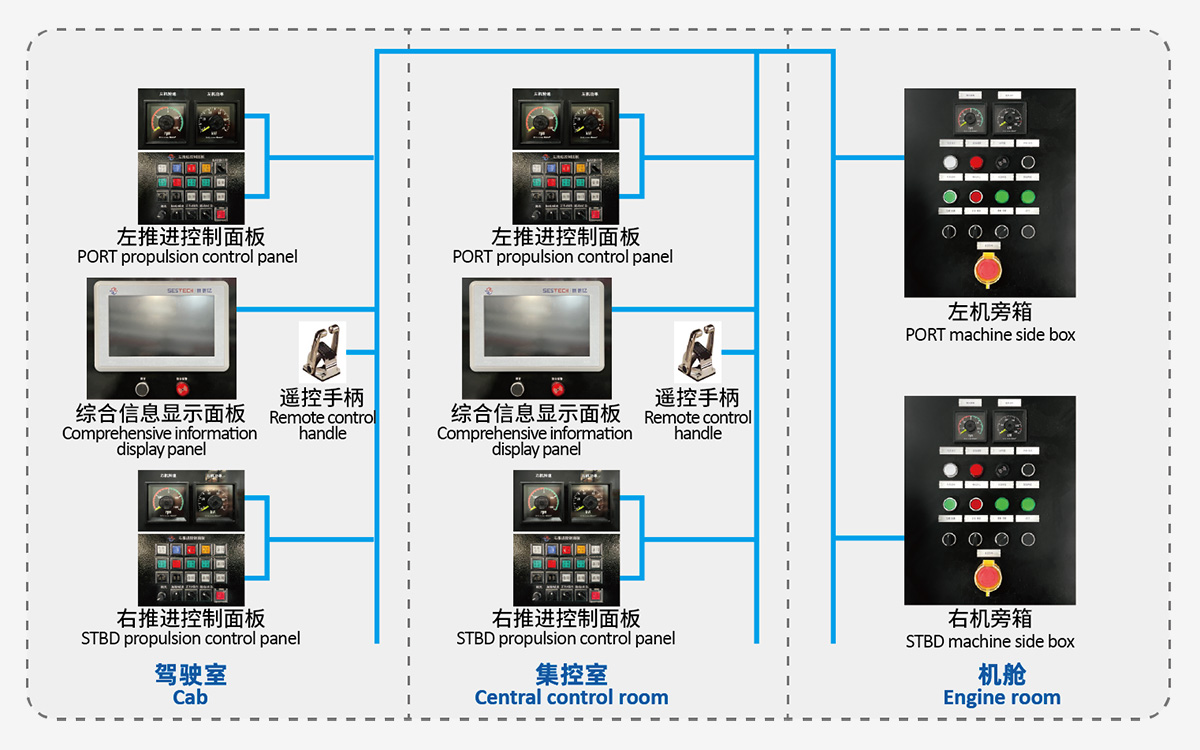 遙控系統(tǒng)由機(jī)旁控制、駕控控制、電池系統(tǒng)控制及綜合監(jiān)控系統(tǒng)組成,整套遙控系統(tǒng)和電力推進(jìn)系統(tǒng)基于PLC控制單元和現(xiàn)場(chǎng)總線網(wǎng)絡(luò)相結(jié)合,實(shí)現(xiàn)船員對(duì)于整船動(dòng)力的人機(jī)交互和控制功能,可以通過(guò)不同站點(diǎn)實(shí)現(xiàn)對(duì)推進(jìn)電機(jī)的啟停、調(diào)速控制,以及各站點(diǎn)的操作切換,同時(shí)可以實(shí)時(shí)監(jiān)控船舶推進(jìn)系統(tǒng)各個(gè)設(shè)備的運(yùn)行狀態(tài)、報(bào)警信息。