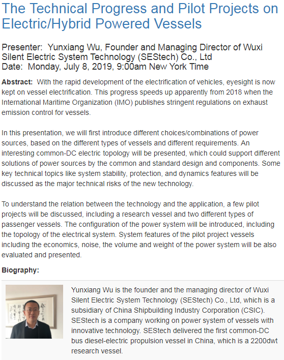 7月8日,賽思億總經(jīng)理烏云翔在IEEE Transportation Electrification Community舉辦了網(wǎng)絡(luò)研討會,進(jìn)行電力及混合動力船舶技術(shù)介紹及實(shí)船案例分享。