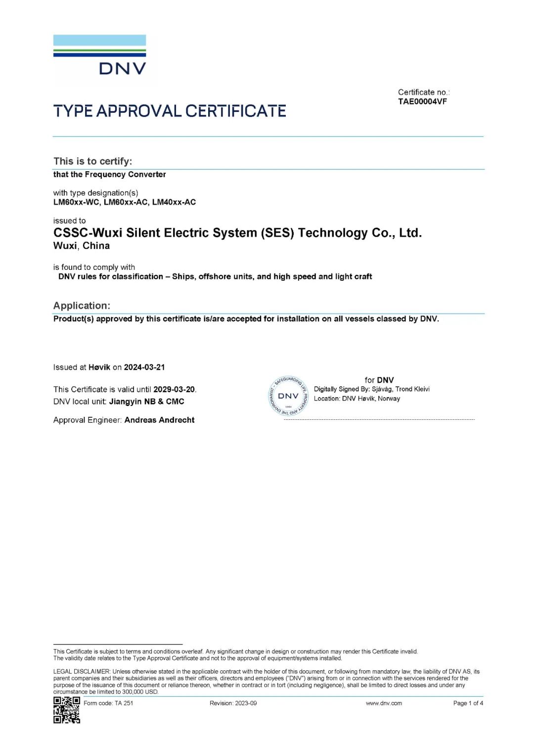 2024年3月21日,中船賽思億(無錫)電氣科技有限公司核心變頻電控設(shè)備順利取得挪威船級社(DNV)型式認可證書,成為國內(nèi)首家取得挪威船級社(DNV)型式認可證書的國產(chǎn)船舶電力推進企業(yè),對賽思億的海外市場開拓具有里程碑意義。
