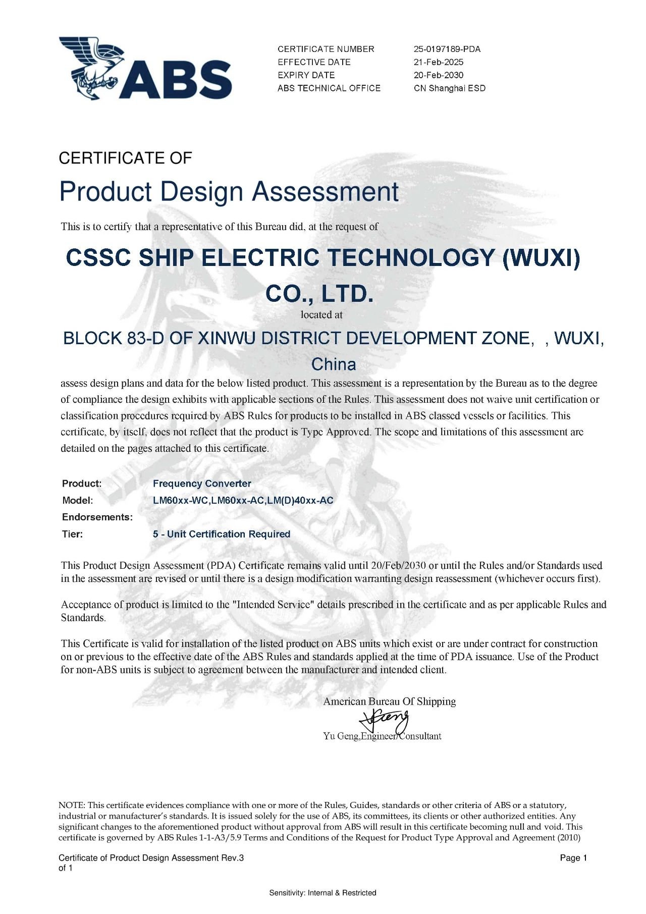 2025年2月21日,中船賽思億(無錫)電氣科技有限公司(CSSC Ship Electric Technology ( Wuxi) Co.,Ltd.)核心變頻電控設(shè)備順利取得美國船級社(ABS)型式認(rèn)可證書,成為國內(nèi)為數(shù)不多的取得美國船級社(ABS)型式認(rèn)可證書的船舶電力推進(jìn)企業(yè)。目前中船賽思億已取得CCS、BV、RINA、DNV、LR、ABS等六大國際主流船級社型式認(rèn)可證書,是目前國內(nèi)唯一一家擁有六大船級社型式認(rèn)可證書的國產(chǎn)船舶電力推進(jìn)企業(yè),對中船賽思億的海內(nèi)外市場開拓和國際化發(fā)展進(jìn)程,具有重要意義。
