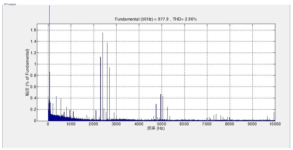 從圖表2可以看到,采用賽思億的變頻器,最大諧波源在于開關(guān)頻率(2.5kHz)附近以及開關(guān)頻率的2倍(5kHz)附近。