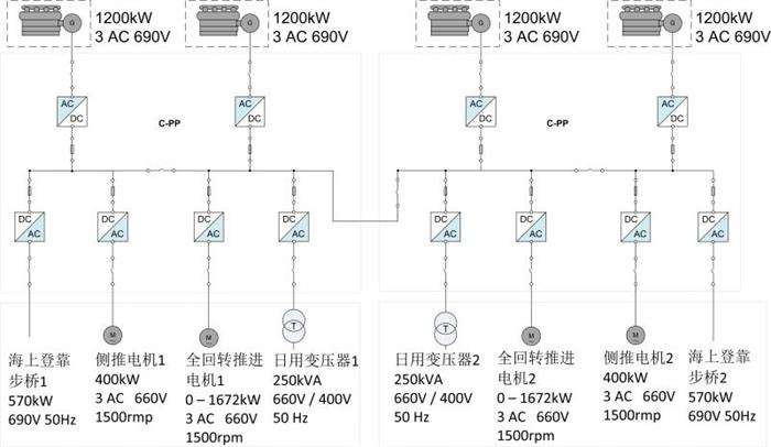 該項(xiàng)目由無(wú)錫賽思億電氣科技有限公司提供的全船直流組網(wǎng)變頻電控系統(tǒng)動(dòng)力總成,供貨范圍包括:直流組網(wǎng)變頻電控系統(tǒng)、柴油發(fā)電機(jī)組、舵槳系統(tǒng)、動(dòng)力定位系統(tǒng)(DP-2)、配電板及機(jī)艙檢測(cè)報(bào)警系統(tǒng)等設(shè)備,順利通過(guò)了首次海試任務(wù),完全符合船東的技術(shù)要求,滿(mǎn)足本船的使用條件,獲得了船東、船廠(chǎng)及設(shè)計(jì)院的高度的贊賞。直流組網(wǎng)技術(shù)在“雄程天威1”號(hào)上的應(yīng)用,不僅解決了雙體船機(jī)艙空間小的問(wèn)題,還可充分滿(mǎn)足在風(fēng)場(chǎng)惡劣海況下對(duì)船舶動(dòng)力定位(DP-2)、登乘系統(tǒng)的高動(dòng)態(tài)響應(yīng)能力的技術(shù)要求,進(jìn)一步提升了船舶的動(dòng)態(tài)響應(yīng)特性。