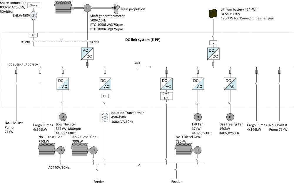 鼎衡15000噸化學(xué)品船,船舶總長(zhǎng)147米,型寬22米,入級(jí)BV船級(jí)社,抱軸電機(jī)額定功率為1000kW,同時(shí)配置424kWh電池達(dá)到削峰填谷的目的,該船舶混合動(dòng)力系統(tǒng)采用直流組網(wǎng)形式,將主機(jī)、發(fā)電機(jī)組、電池動(dòng)力整合并高效分配,為用戶提供高效、綠色、可靠的混合動(dòng)力。將于2021年年初完成安裝調(diào)試。