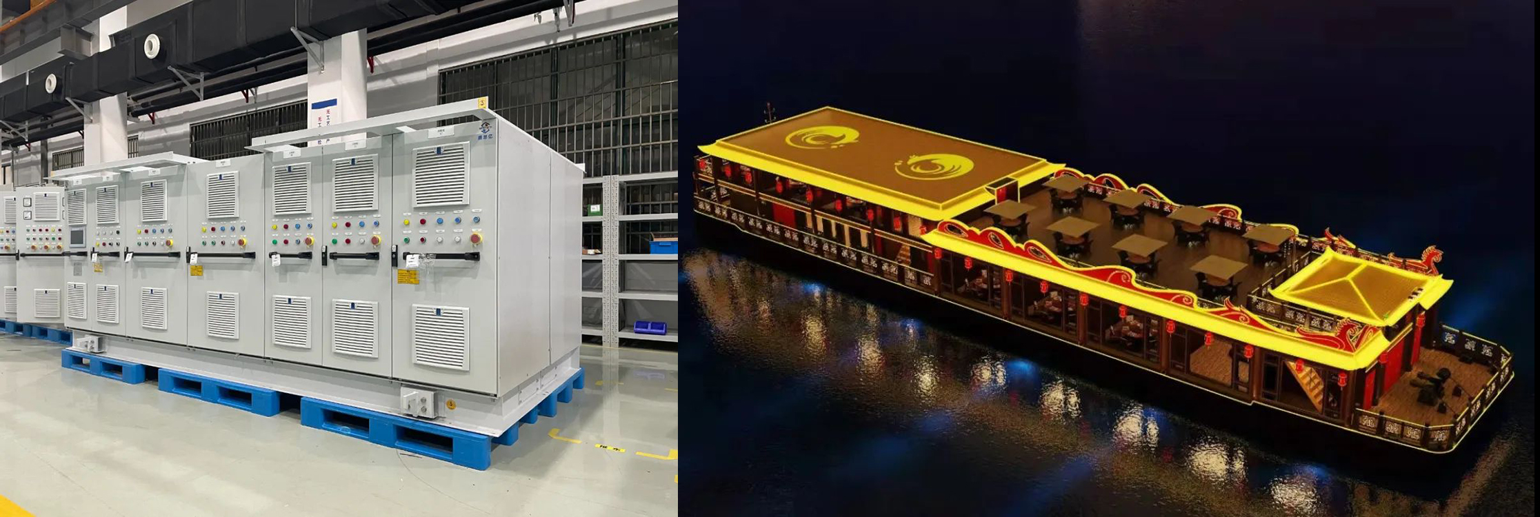 “大唐1號”游船由廣元市武則天文化旅游產(chǎn)業(yè)發(fā)展有限公司打造,由中國船舶集團有限公司第七一九研究所總體設(shè)計并集成供貨,賽思億國產(chǎn)變頻電控設(shè)備成為其關(guān)鍵設(shè)備供應(yīng)商,為該系統(tǒng)提供共直流母線裝置。該船總長50.8m,型寬10.8m,型深2.8m,載客300人,整船鋰電池容量共計1397.76kWh,是目前西南地區(qū)電池容量最大、船舶尺度最大的純電動客船。該船動力系統(tǒng)經(jīng)過賽思億自主知識產(chǎn)權(quán)的直流母線變頻電控設(shè)備在直流母線進行并網(wǎng),驅(qū)動2臺225kW的全回轉(zhuǎn)舵槳,同時可為船舶日用負載提供高品質(zhì)的日用交流電源。