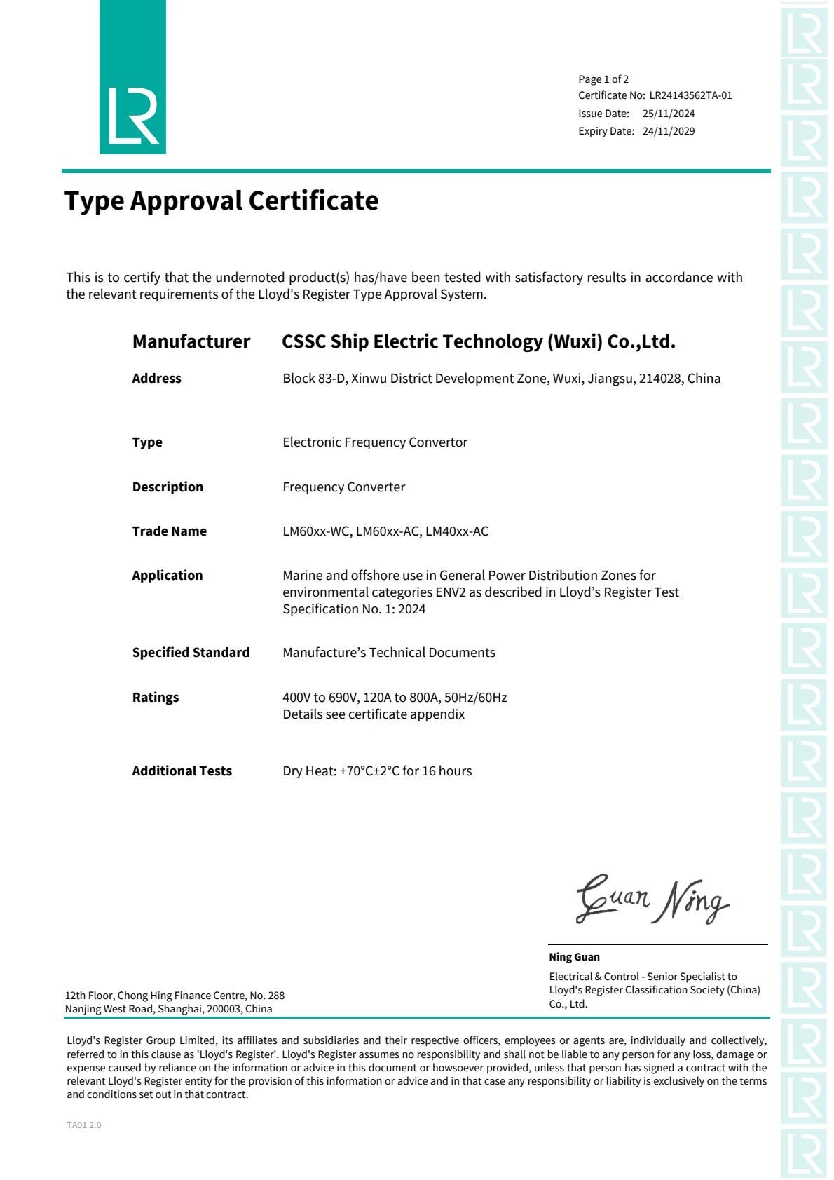 2024年11月25日,中船賽思億(無(wú)錫)電氣科技有限公司(CSSC Ship Electric Technology ( Wuxi) Co.,Ltd.)核心變頻電控設(shè)備順利取得英國(guó)勞氏船級(jí)社(LR)型式認(rèn)可證書,成為國(guó)內(nèi)為數(shù)不多的取得英國(guó)勞氏船級(jí)社(LR)型式認(rèn)可證書的船舶電力推進(jìn)企業(yè)。目前中船賽思億已取得CCS、BV、RINA、DNV、LR等五大國(guó)際主流船級(jí)社型式認(rèn)可證書,是目前國(guó)內(nèi)唯一一家擁有五大船級(jí)社型式認(rèn)可證書的國(guó)產(chǎn)船舶電力推進(jìn)企業(yè),對(duì)中船賽思億的海內(nèi)外市場(chǎng)開拓和國(guó)際化發(fā)展進(jìn)程,具有重要意義。